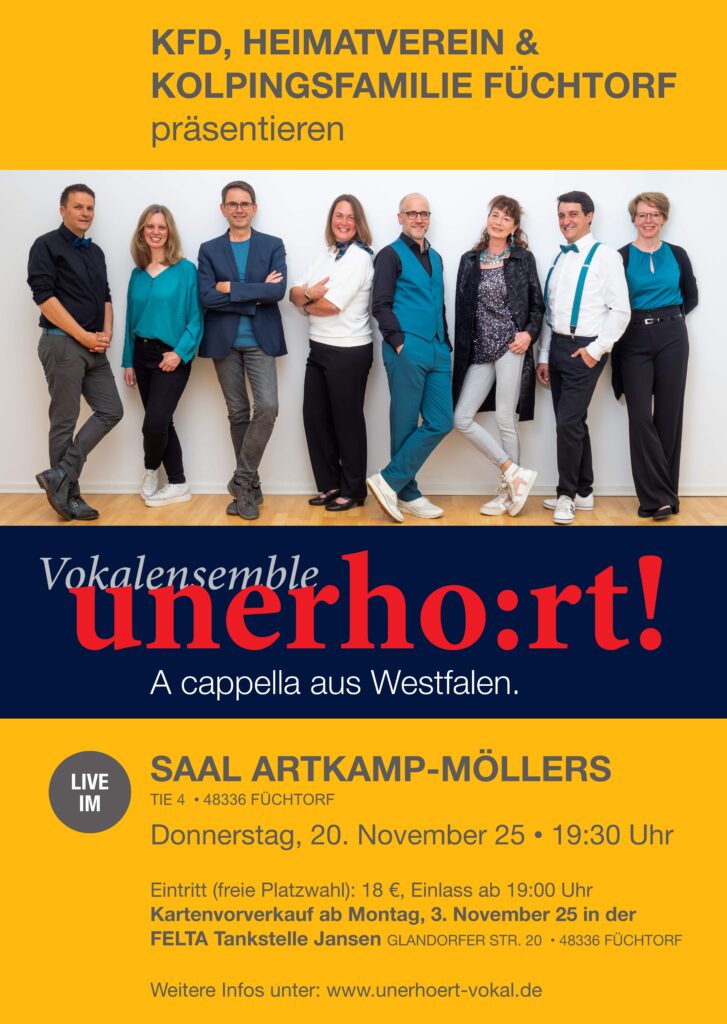 Am Donnerstag, 20. November 2025 gestalten wir den Kulturabend in Füchtorf. In diesem Jahr veranstaltet die kfd Füchtorf den Kulturabend, der gemeinsam mit der Kolpingfamilie und dem Heimatverein getragen wird. Ab 19:30 Uhr erklingen wir in der Gaststätte Artkamp-Möllers.